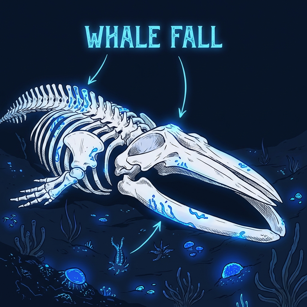 A single whale fall can support over 200 species, many found nowhere else. The chemosynthetic phase can last 50 to 100 years before the bones are finally consumed. In 1987, researchers aboard the submersible Alvin discovered the first known whale fall—a blue whale skeleton carpeted with life three kilometers below the surface.