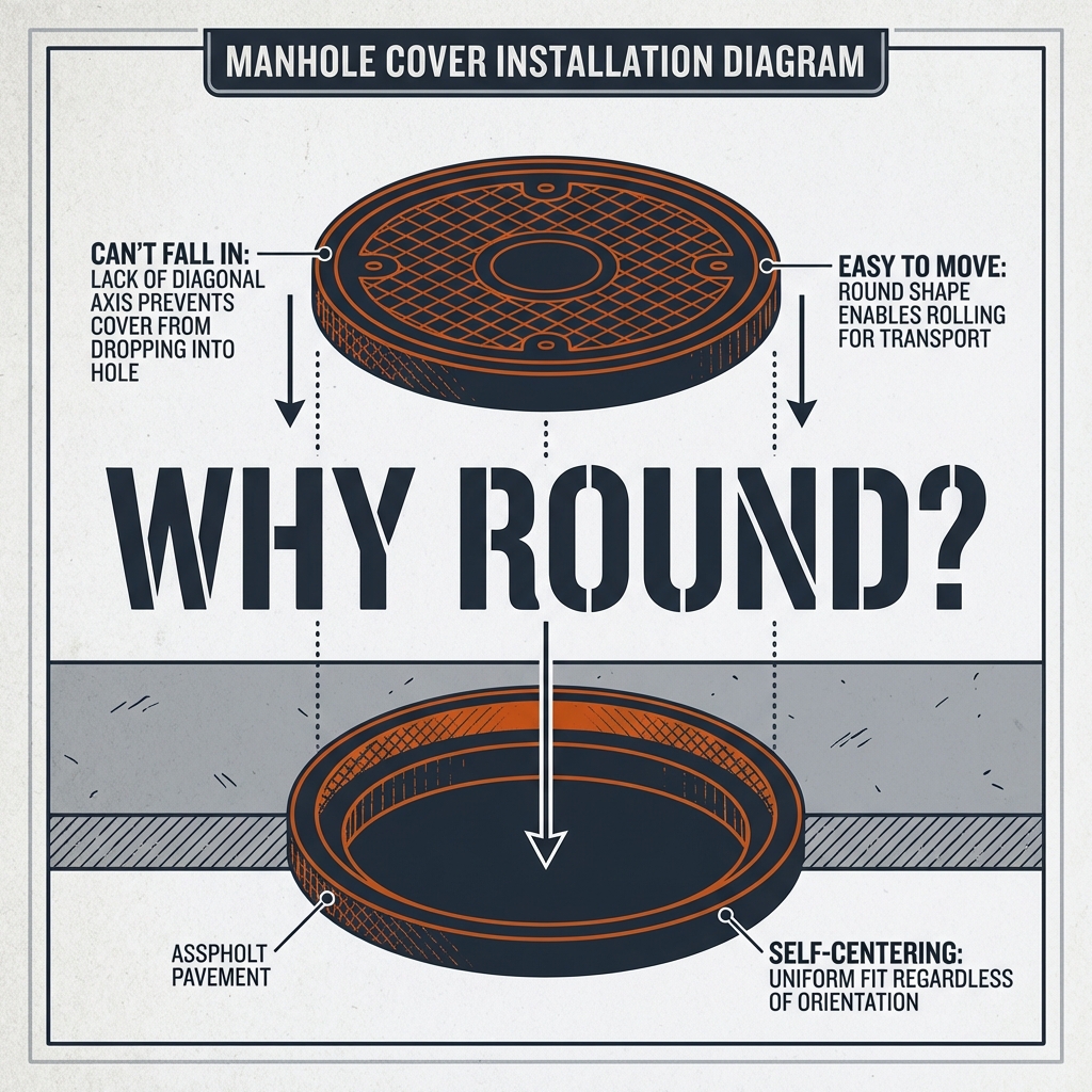 The engineering goes deeper than just not killing maintenance workers. Underground, the cylindrical shape resists the compression of the surrounding earth more effectively than corners would. Above ground, when trucks roll over the cover, the circular rim distributes weight evenly around its entire circumference. No weak points, no stress concentrations.