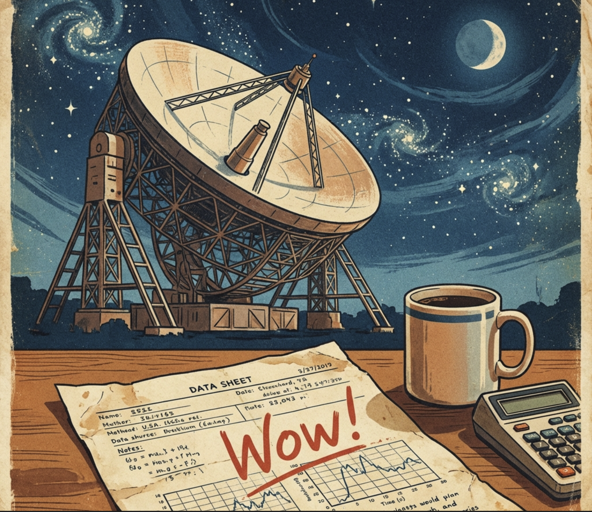 The Big Ear telescope at Ohio State University had been scanning the sky for signs of intelligent life for several years when its equipment recorded an unusual burst of radio energy. Astronomer Jerry Ehman found it a few days later while reviewing printouts of the night's data. The signal appeared as the sequence "6EQUJ5," representing the intensity rising and falling over the observation window. Ehman circled it in red ink and wrote "Wow!" in the margin. The name stuck.