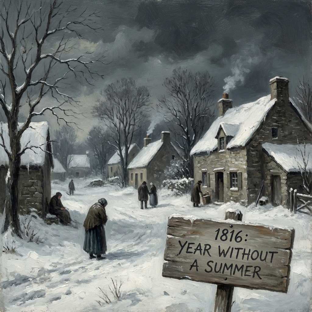 In New England, frost struck every month of the year. Snow fell in June across New York and Maine. Farmers in Vermont watched their crops wither and die repeatedly throughout what should have been the growing season. Grain prices surged across Europe, where the situation was even worse. Germany saw bread riots. Switzerland declared a national emergency. In Ireland, a cold and relentless rain destroyed the potato and oat harvests, triggering a famine and a typhus epidemic that killed 65,000 people.