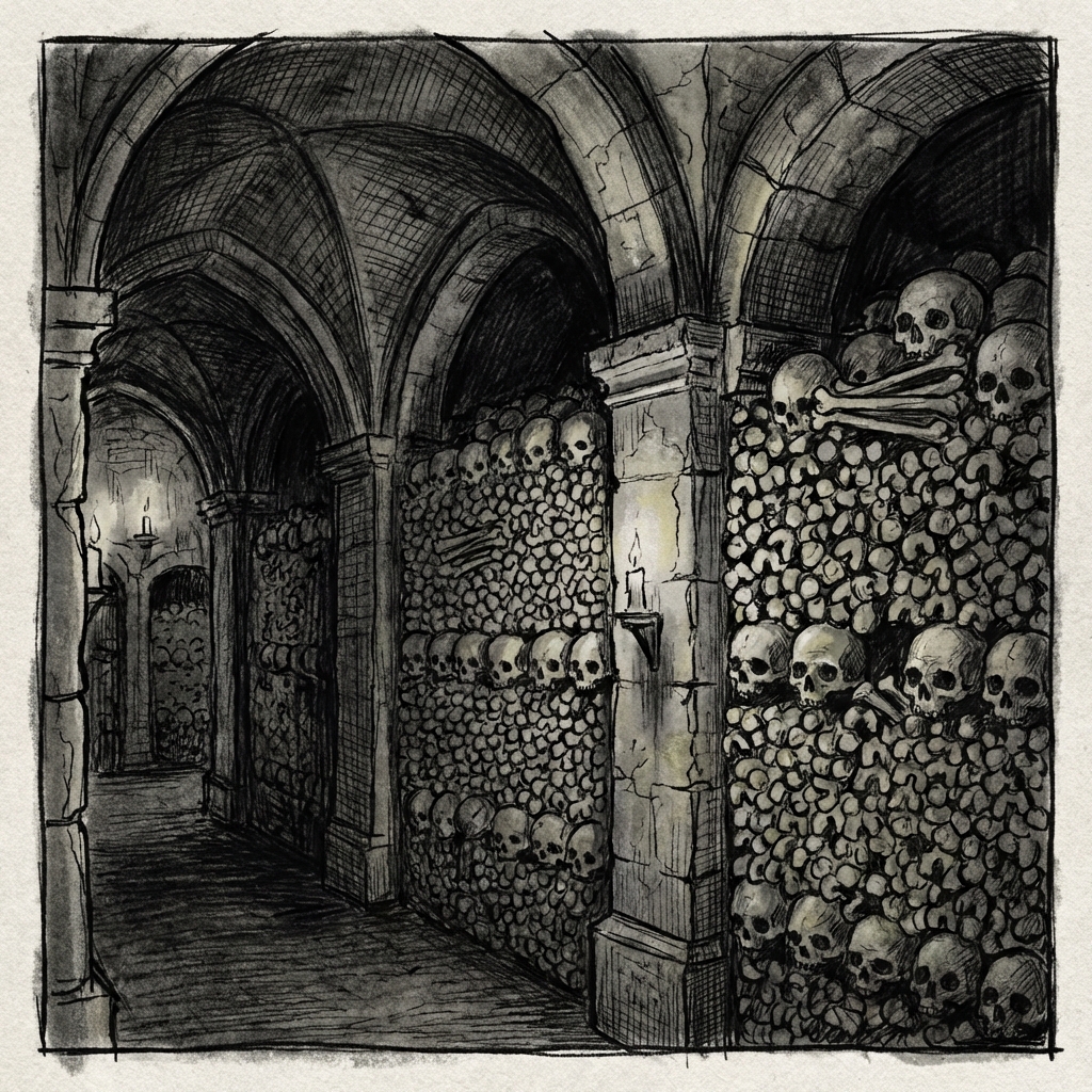 The bones are stacked floor to ceiling in carefully arranged walls—femurs laid horizontally, skulls placed in neat rows at regular intervals to create a repeating pattern. The arrangement is deliberate, almost decorative, and it stretches for more than a mile through the tunnels that are open to the public. The total tunnel network extends for nearly 200 miles.