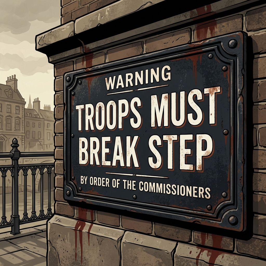 As the soldiers crossed in step, the bridge began to sway. The bolts on one side of the deck sheared, and the bridge dropped several feet, throwing soldiers against the railings and into the River Irwell below. Remarkably, nobody died, though about twenty soldiers were injured.